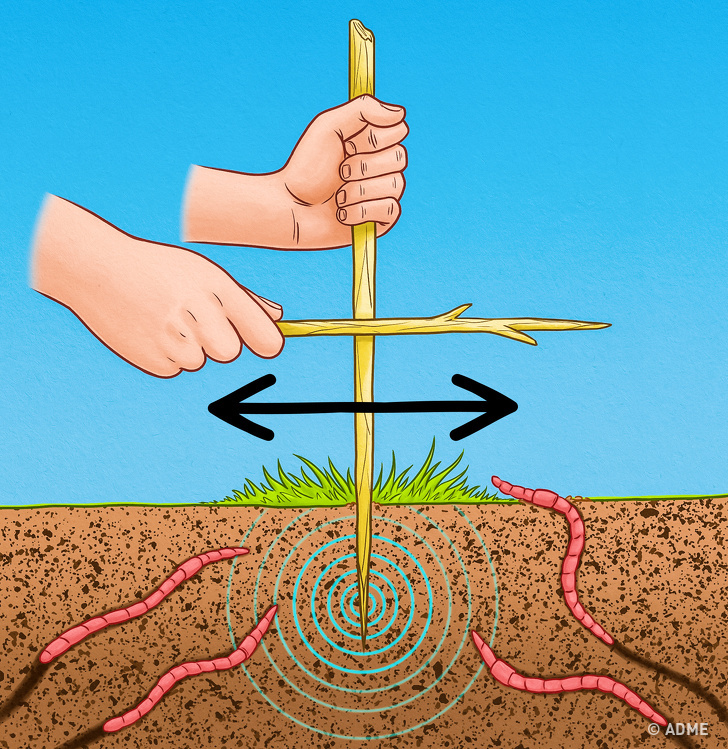 Знайдіть вологий грунт або переверніть гниле повалене дерево. Візьміть 2 палиці: одну застроміть в землю, а другий починайте робити пиляльні руху по першій. Через 2-3 хвилини на поверхню вилізуть дощові черв'яки — ваша наживка для лову риби.
