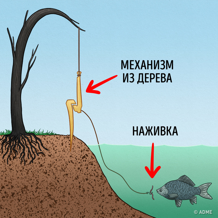 Як робити: знайдіть біля води невелике молоде деревце. Вбийте біля нього спусковий гачок, що складається з двох дерев'яних клинів, зацепленных один за одного. Нахиліть деревце і прив'яжіть його верхівку до верхнього клину. Туди ж прикріпіть мотузку з гачком і наживкою. Коли риба схопить наживку, пастка спрацює і викине рибу на берег.