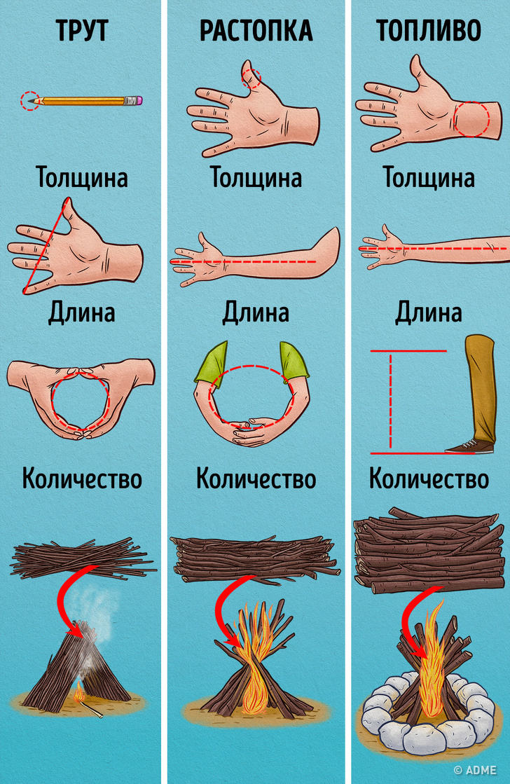 - Паливо — деревина, яка дозволить горіти вогню довго. Гілки повинні бути завтовшки ваше зап'ястя або трохи товщі. Зламайте їх так, щоб довжина дорівнювала довжині вашої руки.