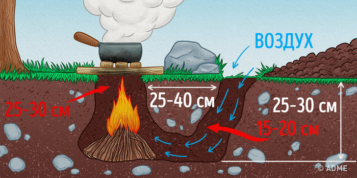 Все, що потрібно зробити, - це викопати яму глибиною 10-12 см і покласти туди деревину. Потім викопати ще одну яму під кутом, яка буде забезпечувати вогнище повітрям. Такий багаття варто копати біля дерева, щоб розвіяти дим. А в кінці тліюче вугілля можна просто засипати, не боячись влаштувати пожежу.