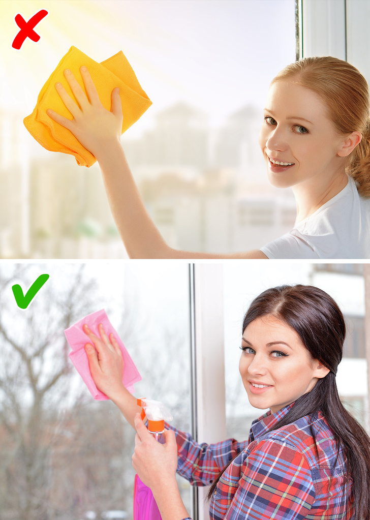 Зазвичай господині намагаються приурочити процес миття вікон до сонячного і жаркого дня, щоб кожна цятка і розлучення були чудово видно при збиранні. Насправді це помилка, адже використовуване при цьому засіб для полірування стекол і навіть проста вода миттєво висихають, залишаючи сліди, з якими важко боротися. Перенесіть миття вікон на хмарний день, і зусиль на цей процес витратиться набагато менше.