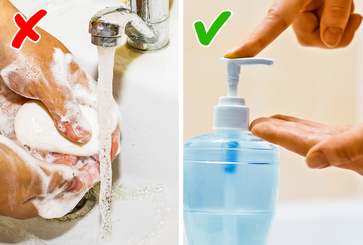 Для того щоб у ванній було менше безладу, використовуйте рідке мило замість звичайного. Тверде мило залишає патьоки на раковині, які потім доводиться довго і ретельно відтирати, а рідке, навпаки, економить масу часу. До того ж лікарі стверджують, що на шматок звичайного мила шкідливі бактерії розвиваються з космічною швидкістю.