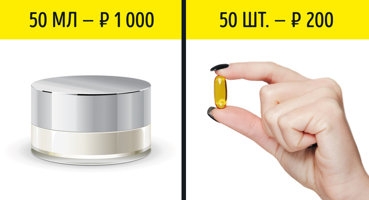 Купивши крем за 1 000-2 000 рублів, в результаті отримуємо дуже мало речовин, які дійсно призводять шкіру в тонус. Вітаміни і добавки в капсулах — альтернатива, яка обійдеться мінімум в 5-10 разів дешевше.