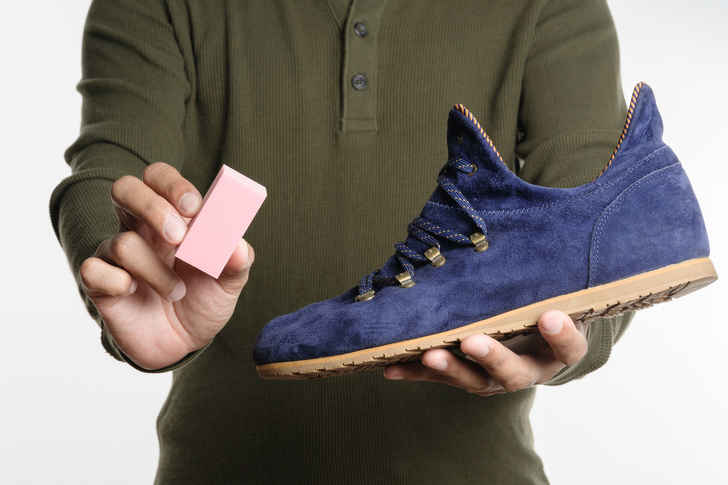 Для догляду за ворсистими матеріалами відмінно підійде звичайна гумка. При терті об поверхню ластик кришиться і проникає вглиб ворсу, крихти чіпляються за пил і бруд і «залишають» замшу або нубук разом із забрудненнями. Потім крихти потрібно вичистити щіткою для взуття.