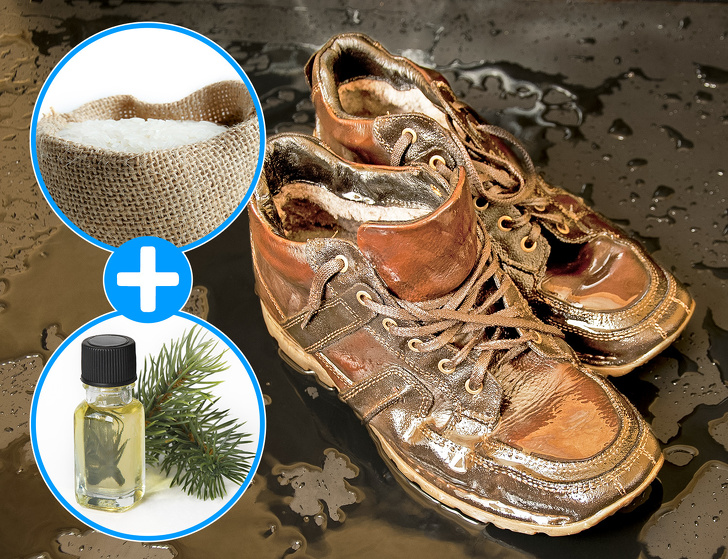 Якщо ви потрапили під дощ або настали в калюжу, то не поспішайте ставити взуття на батарею. Краще насипте звичайний рис у лляній або бавовняний мішечок і помістіть його в взуття. Рис добре забирає вологу, а пара крапель ефірного масла евкаліпта або ялиці ще й допоможуть впоратися з неприємним запахом.