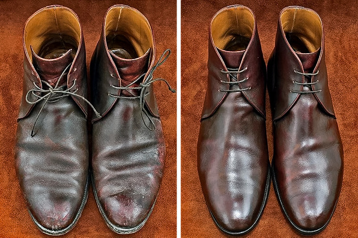 З часом на шкіряного взуття з'являються заломи, схожі на зморшки. Насправді шкіра взуття така ж, як шкіра на нашому тілі, тому її потрібно плекати спеціальним кремом. Нанесіть крем на взуття, залиште на пару годин для вбирання і потім починайте полірувати. В якості альтернативи можна використовувати вазелін або дитячий крем.