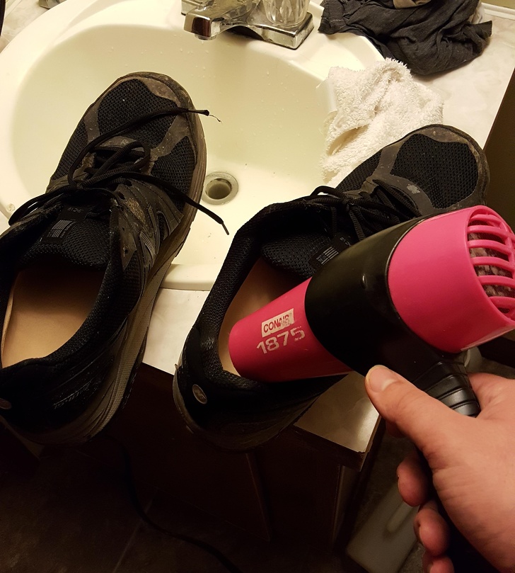 Взуття в жодному разі не можна сушити на батареї і взагалі бажано берегти від високих температур, щоб уникнути деформації. Щоб просохнути, взуття потрібно від 24 до 48 годин. Саме тому непогано мати кілька пар на кожен сезон, щоб було що носити, поки одна пара сушиться. Але якщо чекати колись — скористайтеся феном, і пам'ятайте, що обдувати можна тільки холодним повітрям.