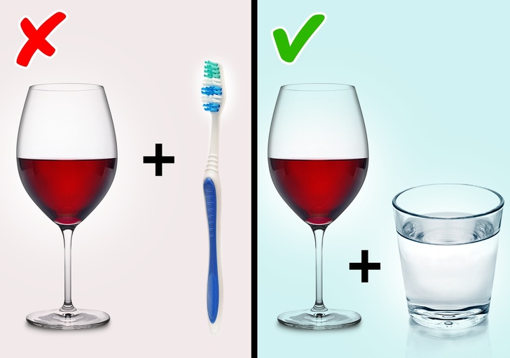 - Червоне вино. Насичений колір і високий вміст танінів роблять червоне вино чемпіоном по фарбуванню зубів. Після цього напою краще прополоскати рот чистою водою, але чистити зуби відразу не треба. Кислота розширює пори, і чищення принесе більше шкоди, ніж користі.