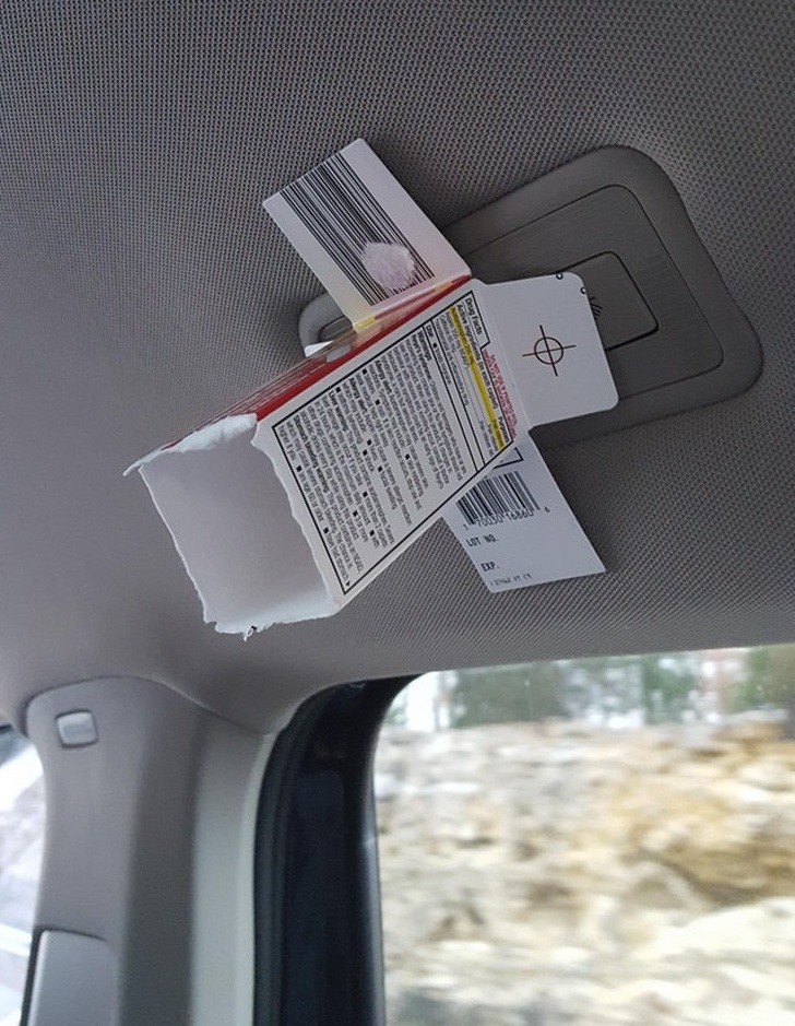 Якщо вночі в машині всі сплять, а вам треба щось знайти, закріпіть на лампі коробку, як показано на фото. Так світло не розбудить інших пасажирів, а буде спрямований тільки туди, куди необхідно.