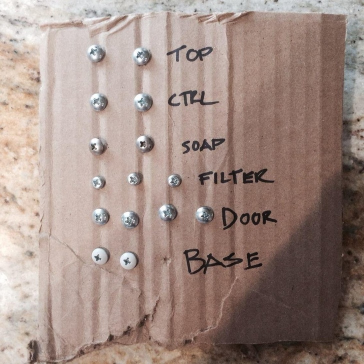 Якщо ви розбираєте якийсь пристрій і боїтеся втратити болти, просто уколів їх на картон і напишіть поруч, від чого вони. Так всі деталі опиняться на своїх місцях і нічого не загубиться.