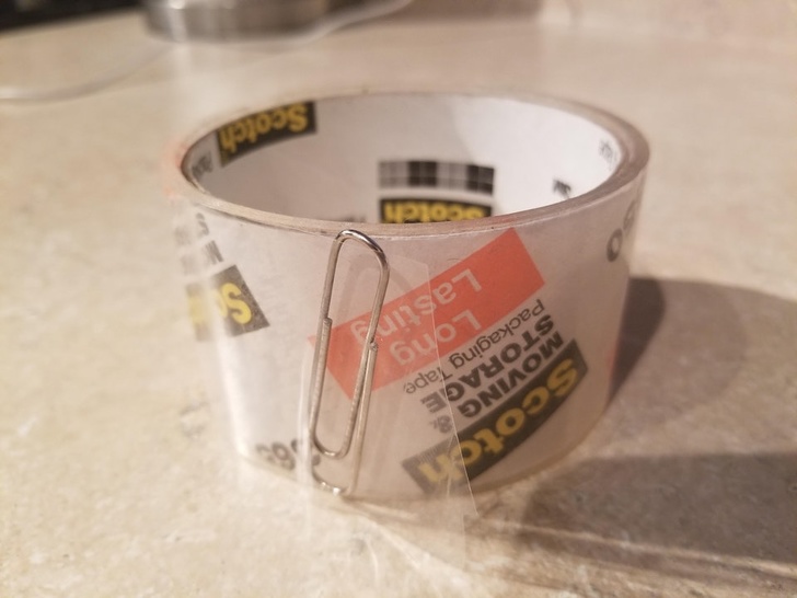 Зрозуміло, метод із загинанням країв скотчу теж відмінно працює, але тоді доводиться кожен раз відрізати шматочок стрічки перед використанням. Скріпка вирішує цю проблему.