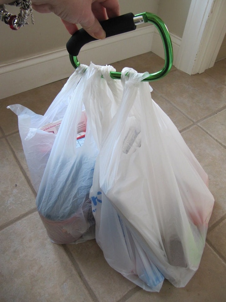Покладіть в багажник великий карабін. Тепер, коли ви будете повертатися з магазину, вам не доведеться бігати з пакетами кілька разів туди-назад: просто закріпіть їх на одному карабіні і заберіть все відразу.