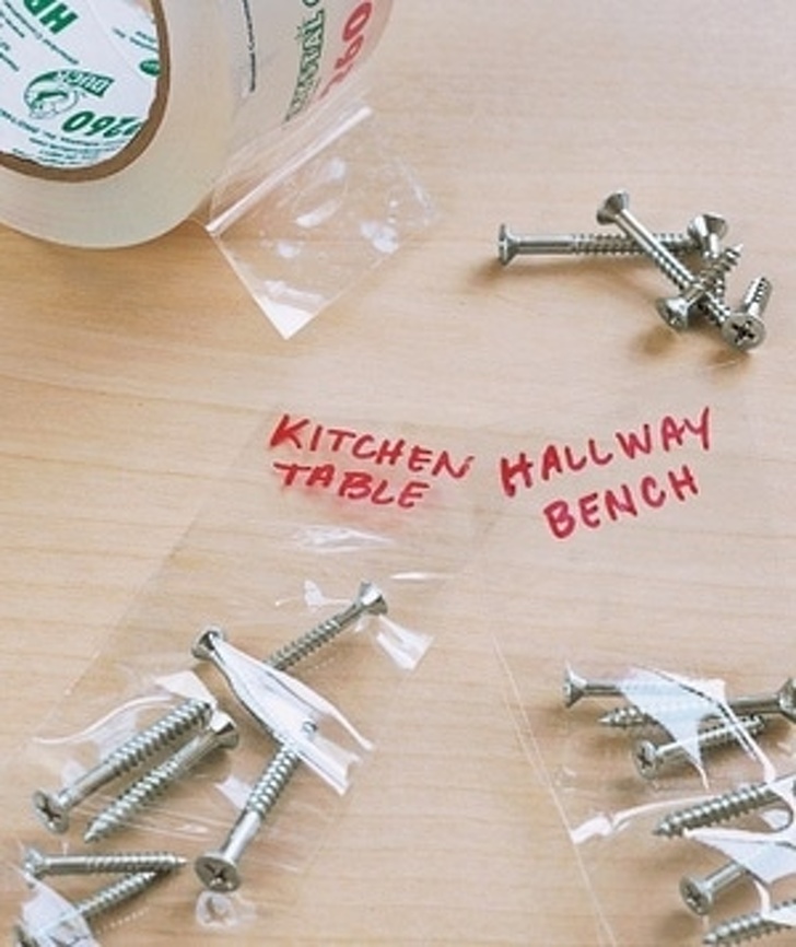 Якщо ви розбираєте меблі для транспортування, маленькі пакети допоможуть вам не розгубити потрібні деталі від неї. Щоб пакетики не загубилися, можна приклеїти їх до меблів скотчем.