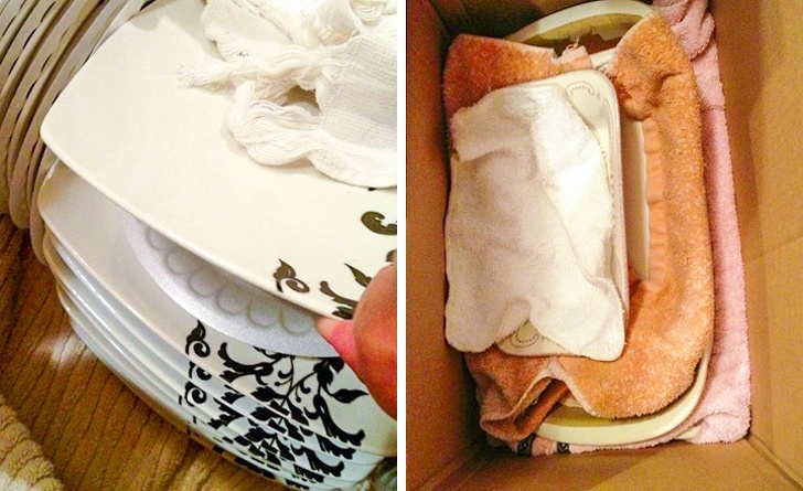 Між звичайними тарілками можна покласти пластикові, тоді вони не розіб'ються, навіть якщо коробку буде трясти. Великі крихкі речі можна загорнути в рушники — так ви одночасно упакуєте все що потрібно і збережіть речі цілими.