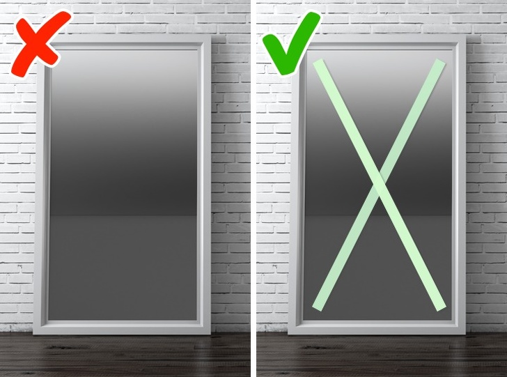 Наклейте на дзеркало широкої смуги клейкої стрічки. Навіть якщо скло пошкодиться при перевезенні, стрічка не дасть йому випасти. Так ви захистите не тільки речі, але і себе.
