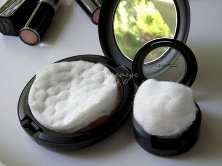 При перевезенні косметика може розсипатися. Уникнути цього допоможуть ватяні диски і кульки. Тільки прослідкуйте, щоб коробочка з косметикою щільно закривалася, а для цього вибирайте кульки не дуже великого розміру.