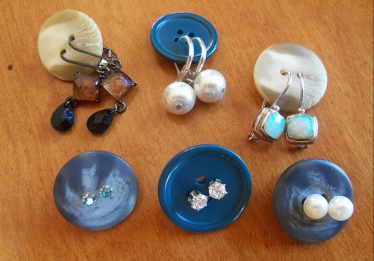 Зберегти в цілості найменші прикраси допоможуть гудзики. Всуньте в них сережки і закріпіть так само, як у вухах. Після цього ґудзики можна скласти в їх звичайне місце зберігання. Тільки прослідкуйте, щоб коробочка з ними була щільно закрита. Можна додатково обмотати її скотчем.