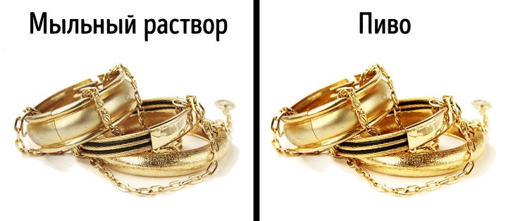Щоб почистити і змусити сяяти прикраси з золота, потрібно протерти їх серветкою, змоченою в світлому пиві. Відмінний результат буде відразу помітний на виробах без домішок, але краще не застосовувати такий спосіб на прикраси з камінням.