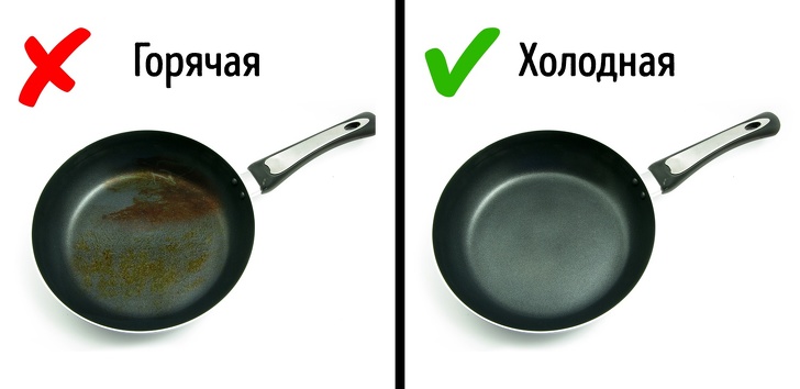 Найпростіший спосіб зіпсувати покриття сковорідки — це замочити її в гарячому вигляді. Це призведе до того, що їжа стане пригорати навіть на хорошому покритті, а жирні сліди буде складніше відмити.