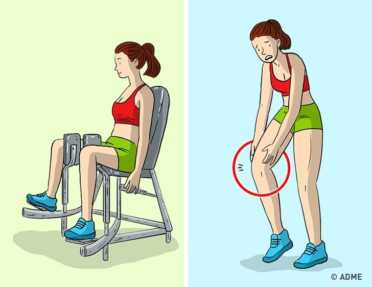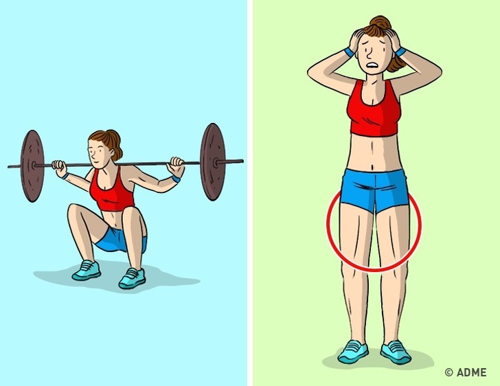 В одному з перших пунктів ми розповіли, що присідання з великою вагою гублять нашу талію. Додамо, що при цьому страждає не тільки тіло, але і ноги. По-перше, навантаження неминуче робить наші стегна схожими на стегна Халка. По-друге, тяжкість може не тільки зіпсувати фігуру, але і завдати шкоди колін і попереку.