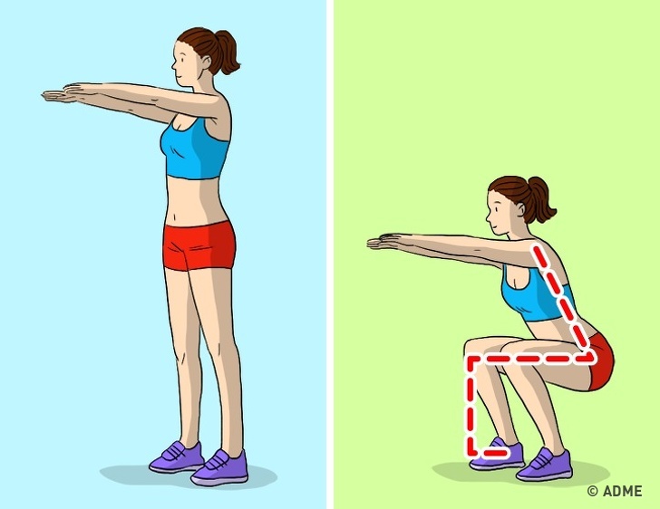 Виконуйте присідання без додаткової ваги або з невеликим навантаженням. Сконцентруйтеся на правильній постановці ніг. Щоб в роботу включалися м'язи сідниць, коліна не повинні виходити за носок.