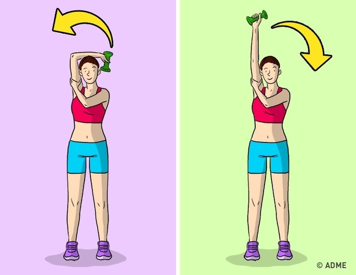 Проблемною зоною багатьох дівчат є внутрішня частина руки, яка називається трицепсом. Розташуйте руки за головою, обхопіть долонею однієї руки лікоть іншої і виконуйте повільні розгинання.