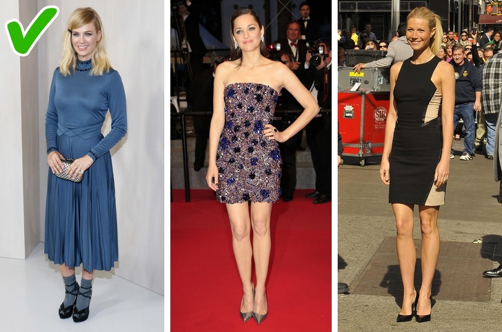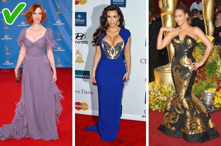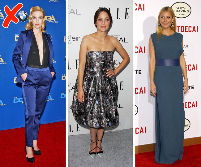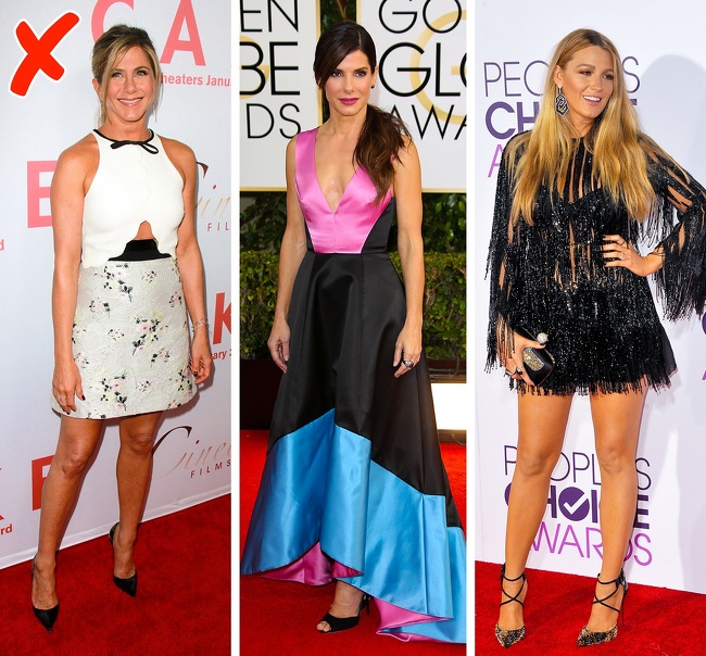 Неприпустимо поділ фігури по горизонталі, також виключаються рюші і волани, ляльковий обсяг суконь, занадто відкритий одяг.