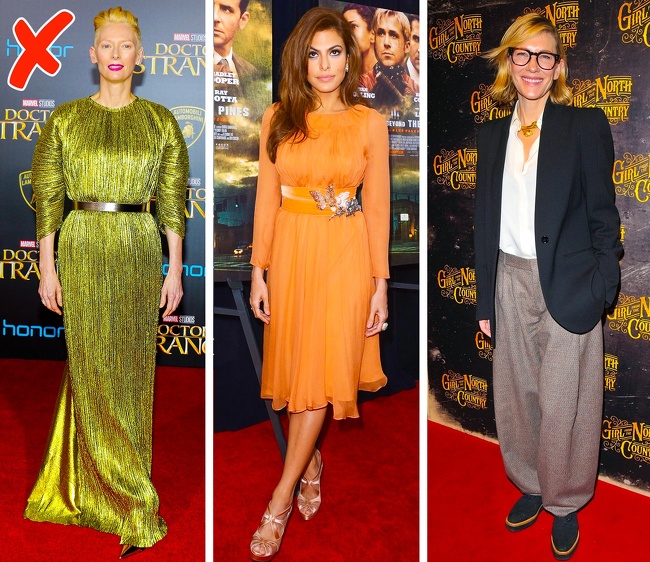 М'яко хвилясті лінії, прозорі, тонкі, «літаючі» або жуйки, що липнуть до тіла тканини — під забороною. Це стосується і широких або безформних силуетів, крупної в'язки, грубого трикотажу.