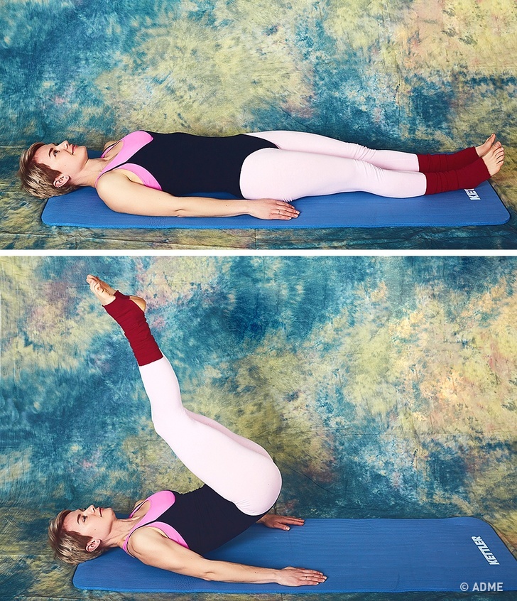 Вправа на нижні м'язи живота: лягаємо на спину, руки витягаємо уздовж тіла або кладемо під спину, як зручніше. Виконуємо скручування і піднімаємо ноги вгору. І так 20 разів.