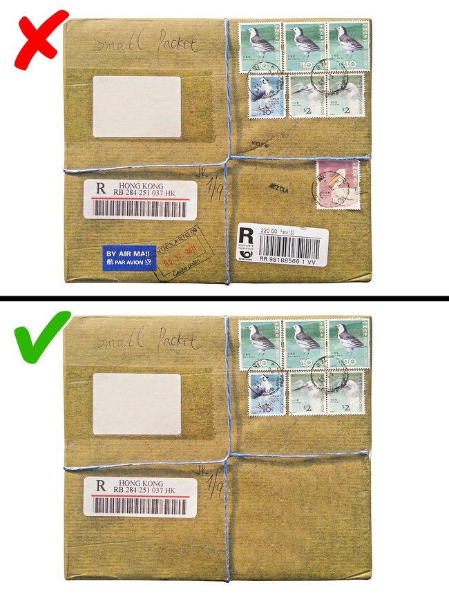 До того ж зверніть увагу на відповідність між марками та зворотною адресою — якщо вони не збігаються, це повинно вас насторожити. Ще одна ознака — дуже велика кількість штампів і поштових марок або ж їх повна відсутність.