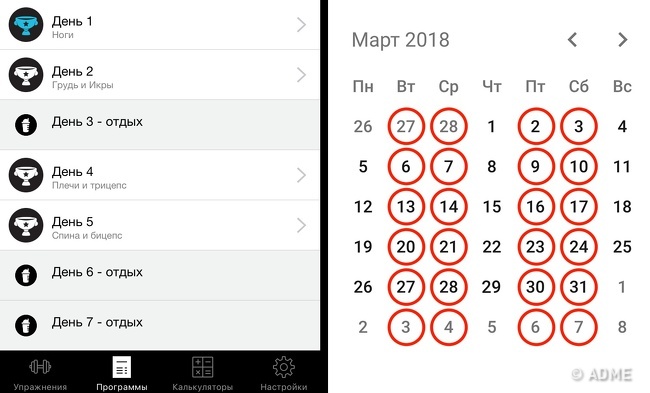 Так виглядають мій календар (червоні кружечки — дні тренувань) і програма вправ, яку я просто підібрав під себе в інтернеті.