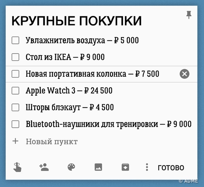 З великими покупками робив по-іншому. Кожен раз, коли мені хотілося щось купити, я задавав собі питання: «Ця річ принесе мені користь, зробить мене краще?» І якщо відповідь була «Так», то вносив цей предмет в список майбутніх витрат. Через 2 тижні я повертався до цього списку, і якщо ця річ мені все ще була потрібна, то купував. Але найчастіше це було хвилинне бажання.