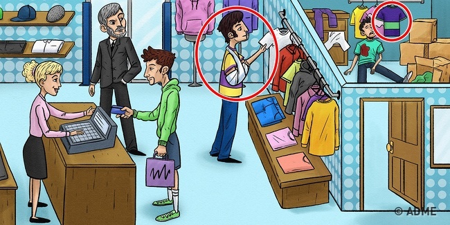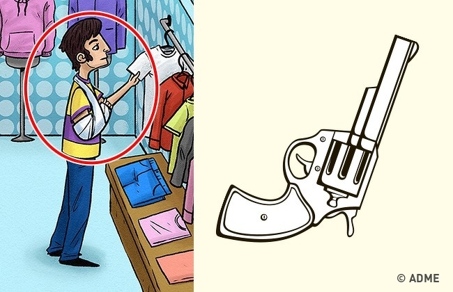 Чоловік з пов'язкою на руці виглядає підозрілим. Адже хто з поламаною рукою приходить купувати речі? Також детектив зазначив, що футболка на цьому чоловікові і в підсобці однакова. Варто замислитися.