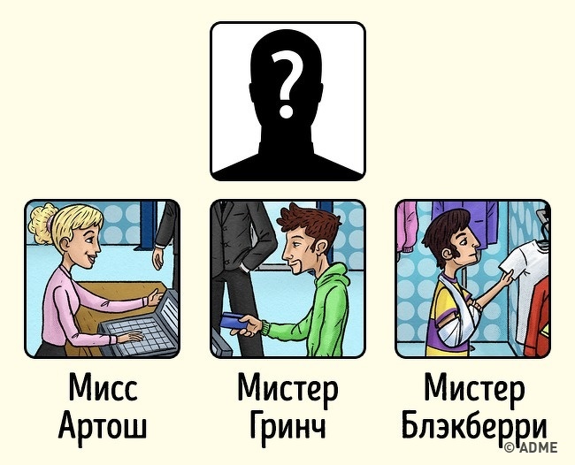 Підозрюваними стали касир — міс Артош, чоловік з валізою — містер Грінч і чоловік з пов'язкою на руці — містер Блекберрі. Всі ці люди в момент вбивства перебували в магазині. Детектив впевнений, що один з них точно вбивця. Начальник охорони попередив, що в момент збою електрики вхід і вихід були заблоковані системою безпеки, а після того як світло включився, двері розблокувалися. Але коли він побачив, що скоєно вбивство, заблокував двері сам.