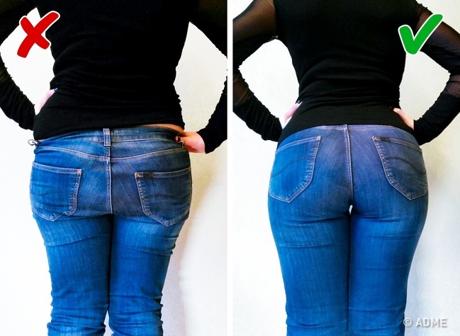 - Що робити: Купувати джинси свого розміру, при цьому краще уникати моделей з сильно заниженою талією. Щоб контролювати положення хребта, час від часу уявляйте, що хтось вилив вам за комір холодної води.