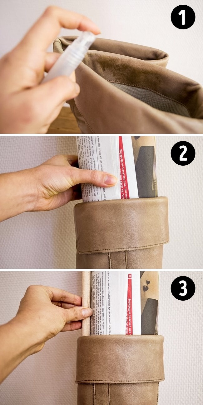 Дивний, але ефективний спосіб можна подивитися тут, і це дійсно працює. Плюс приємний аромат від взуття забезпечений. Чудово!