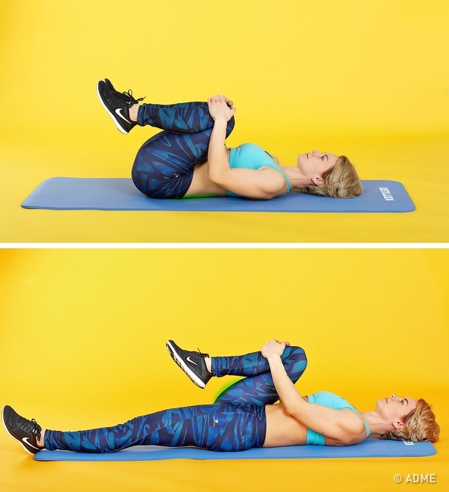 Підтягуємо до грудей обидва коліна. Ліве обхоплюємо руками і максимально притискаємо до грудей. Тільки після цього випрямляємо і опускаємо пряму праву ногу. Залишаємося в такому положенні 30 секунд. Знову підтягуємо коліна до грудей і міняємо ноги.