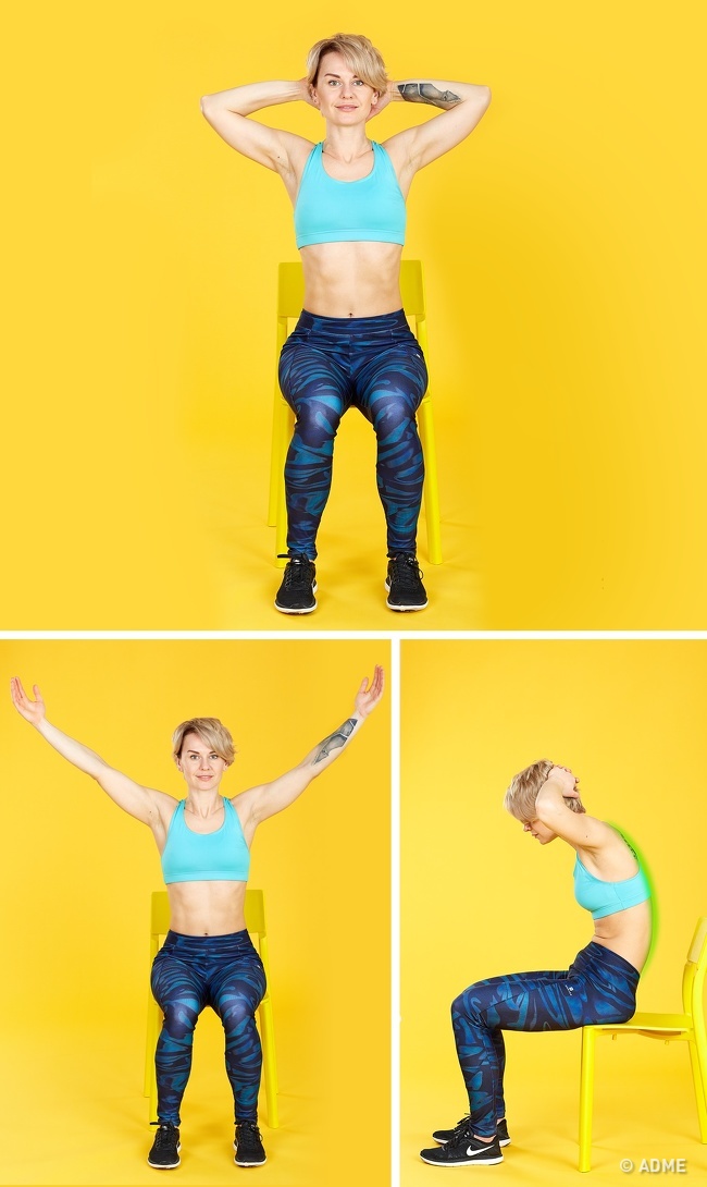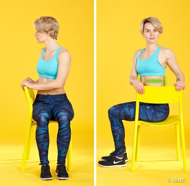 Вихідне положення: сидячи на краю стільця, спина випрямлена. Ноги на ширині плечей, ступні повністю стоять на підлозі.