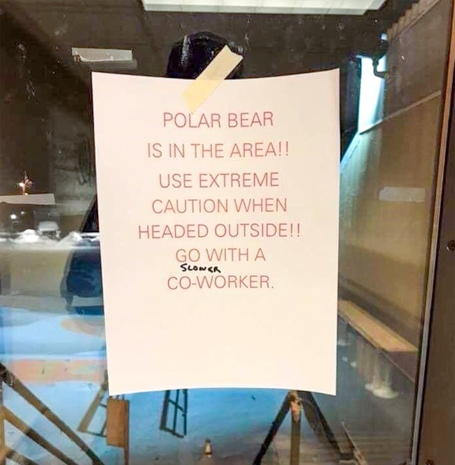 «В цьому районі живе полярний ведмідь. Будьте гранично обережні, коли знаходитесь на вулиці. Ходіть з (більш повільним) колегою».