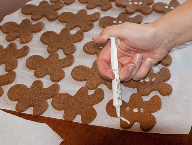 Якщо ви захочете прикрасити випічку, а спеціальних гаджетів не буде під рукою, скористайтеся звичайним шприцом. Всі лінії будуть однакової товщини, а набирати крем дуже легко підняттям поршня.