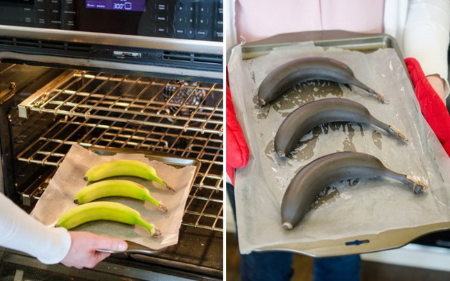 Покладіть незрілі банани на покритий пергаментом деко і поставте в духовку при високій температурі, дайте їм «дозріти». Через 30 хвилин фрукти стануть темними і м'якими на дотик. Охолодіть банани і використовуйте в своїх рецептах.