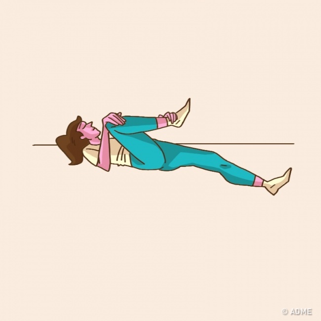 Вихідне положення — лежачи на спині, ноги випрямлені. Закиньте ногу на ногу таким чином, щоб хвора виявилася зверху. Обхопіть ноги руками і з їх допомогою намагайтеся дотягнутися коліном хворої ноги до плеча тієї ж сторони тіла. Що робити далі, ви вже знаєте. Відчувши напругу в м'язах, затримайтеся в цьому положенні на 30 секунд. Розслабтеся і повторіть вправу ще раз, помінявши ноги.