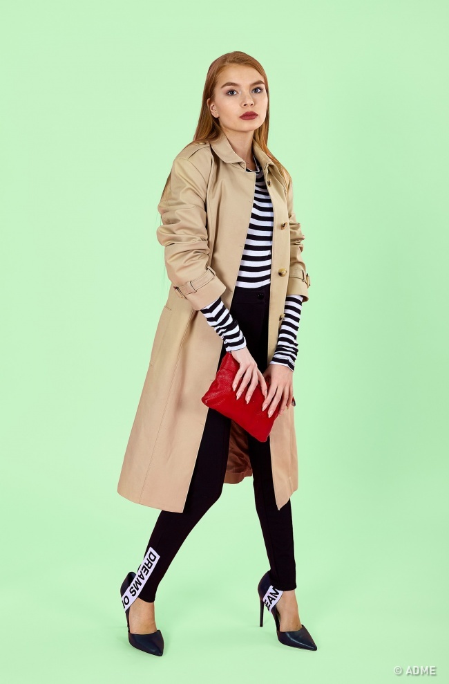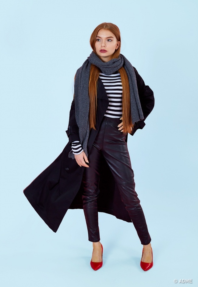 Зухвалий, стильний, елегантний. Цей образ наче з обкладинки модного журналу, але тим не менш відмінно підходить для повсякденного «носіння». Шкіряні штани, смугастий верх і червоні туфлі допоможуть візуально зробити фігуру стрункішою. А пальто допомагає об'єднати ці предмети і перетворить їх в один лаконічний образ.