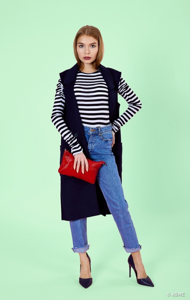 Вільний верх в смужку + джинси — це вулична класика. Той розслаблений образ, який ми бачимо дуже часто. Але іноді варто додати йому трохи строгості, для цього підійдуть накидка, пальто або довгий жилет з прямими лініями і маленька червона сумочка.
