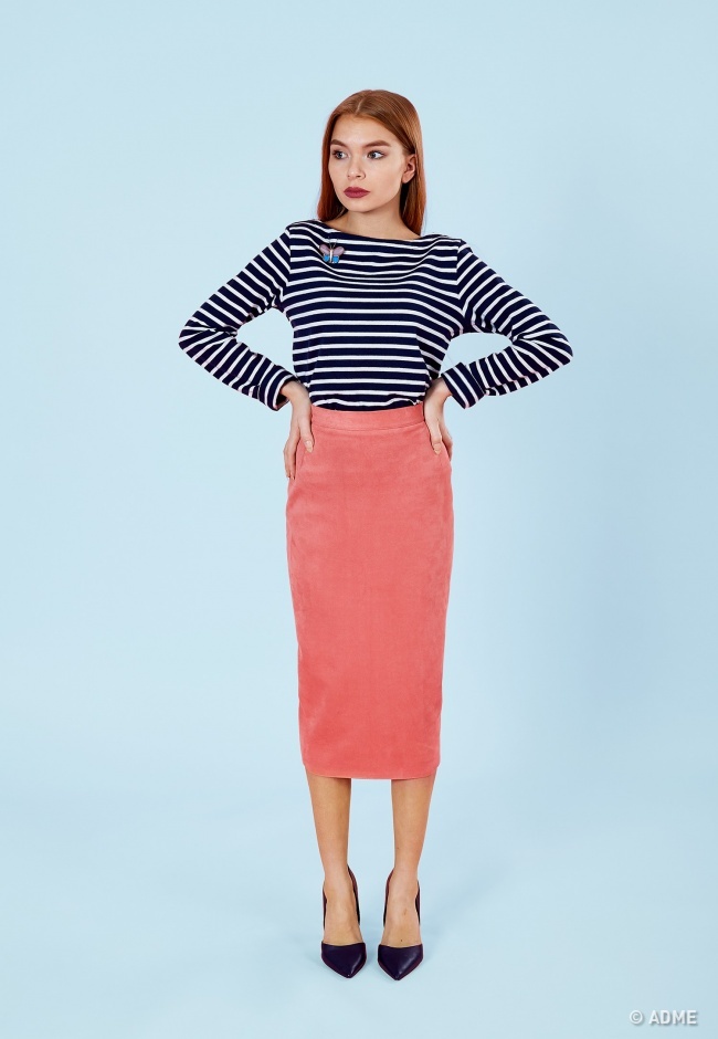 Якщо взяти смугастий верх і додати довгу вузьку спідницю приглушених відтінків, то отримаємо дуже жіночний силует, стрункі ноги, красиву поставу і захоплені погляди оточуючих.