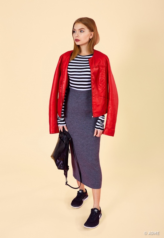 Поєднання тільники, довгою стретч спідниці і кросівок виглядає просто шикарно, а найголовніше, це зручно. Варто лише додати яскравий елемент у вигляді куртки чи плаща, який виділить вас з натовпу.