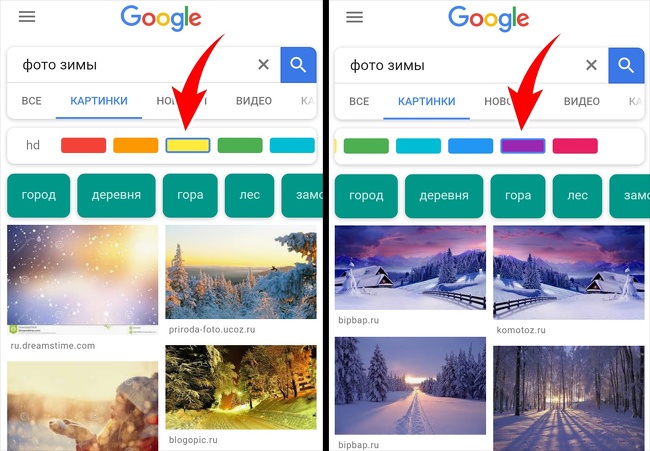 Припустимо, вам потрібні зимові фотографії в чорно-фіолетового. Для цього потрібно ввести пошуковий запит, наприклад "фото зими", натиснути на кнопку "Інструменти" і в підзаголовку "Колір", щоб вибрати потрібний.