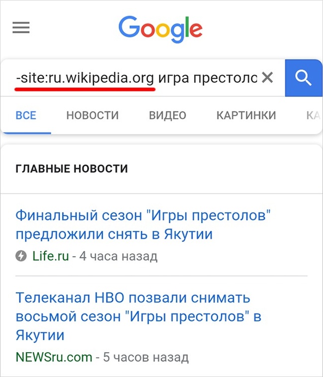 Якщо вам потрібно знайти щось на всіх сайтах, крім одного, перед пошуковим запитом напишіть -site:, наприклад -site:ru.wikipedia.org гра престолів, і ви отримаєте результат зі всіх сайтів, крім вказаного.