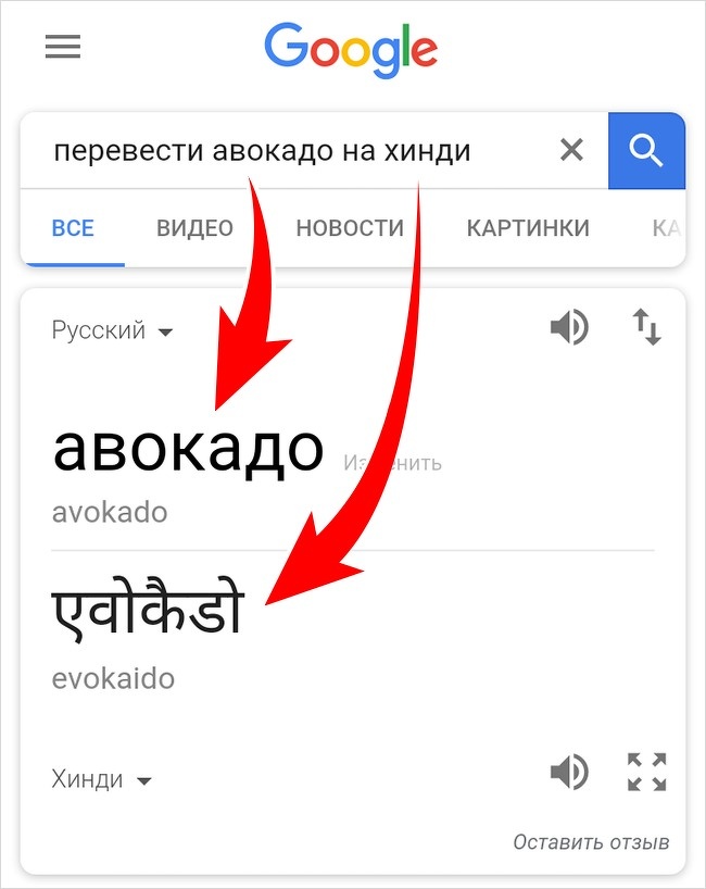 У тому випадку, якщо вам потрібно перевести слово або пропозицію на будь-яку мову світу, просто введіть фразу: перекласти "слово" на "назва мови". Наприклад, "перевести авокадо на хінді".