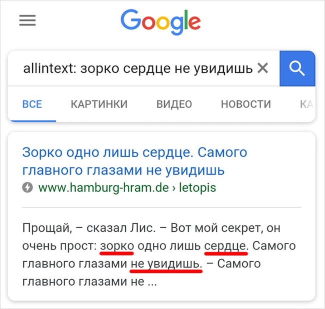 Наприклад, вам потрібно знайти якусь цитату, але ви забули, як точно вона звучить. Просто введіть у пошуковий рядок allintext: і ті слова, які пам'ятайте, Google видасть вам текст, де міститься потрібна цитата.